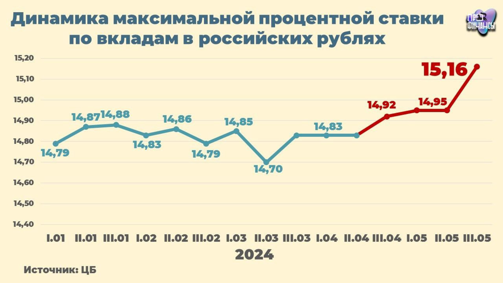 Максимальная ставка по вкладам в рублях в третьей декаде мая по сравнению со второй декадой выросла на 0,21% и составила 15,16 %. Об этом говорится в материалах Банка России.