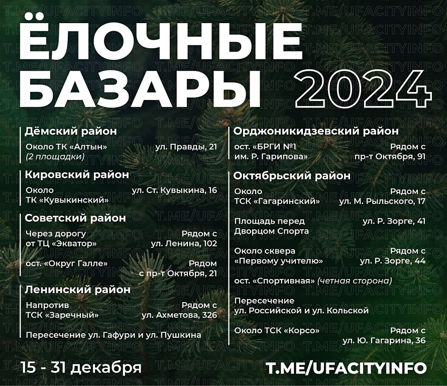 В этом году организаторы уделили особое внимание удобству расположения базаров, чтобы горожане могли легко добраться до них. Важно, что ёлочные базары будут работать не только в центре города, но и в отдалённых районах, что позволит всем жителям Уфы насладиться атмосферой праздника.