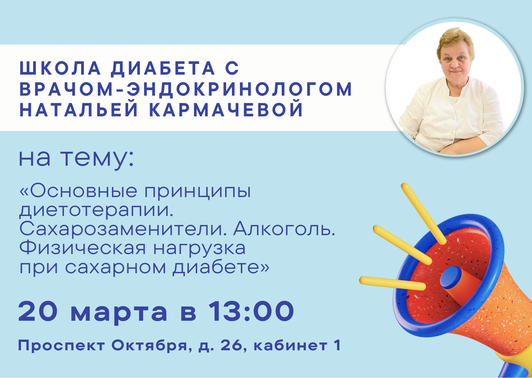 20 марта 2024 года в 13:00 состоится очередная Школа диабета. Врач-эндокринолог Наталья Кармачева проведет занятие на тему «Основные принципы диетотерапии. Сахарозаменители. Алкоголь. Физическая нагрузка при сахарном диабете». Приглашаем всех желающих по адресу: проспект Октября, д. 26, кабинет 1.