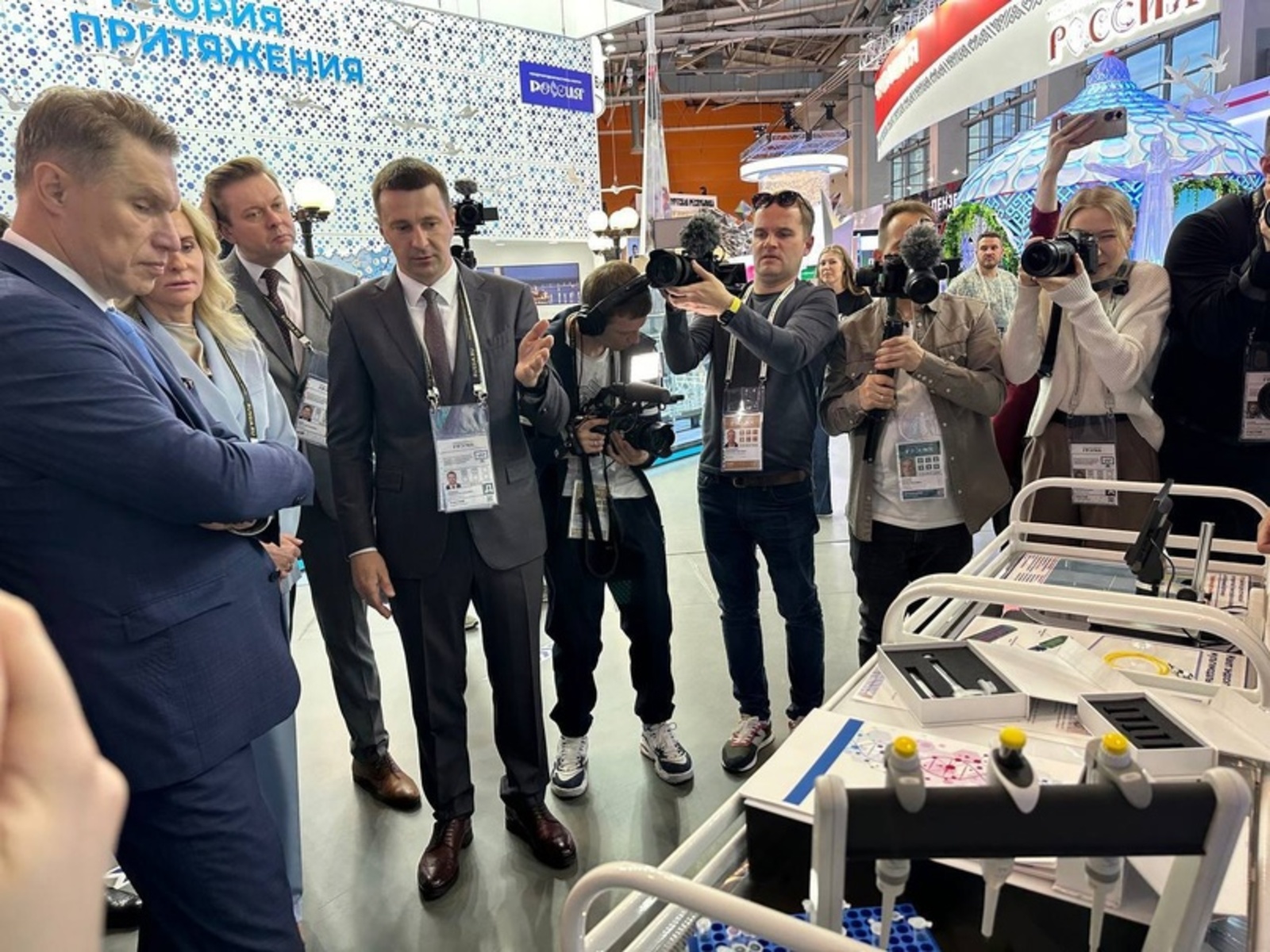 Ольга Кривонос и Михаил Мурашко высоко оценили разработки Евразийского НОЦ, а несколько медицинских продуктов вызвали у них особый интерес. «Будем дальше поддерживать наших ученых в реализации прорывных исследований», — заверил Максим Забелин.