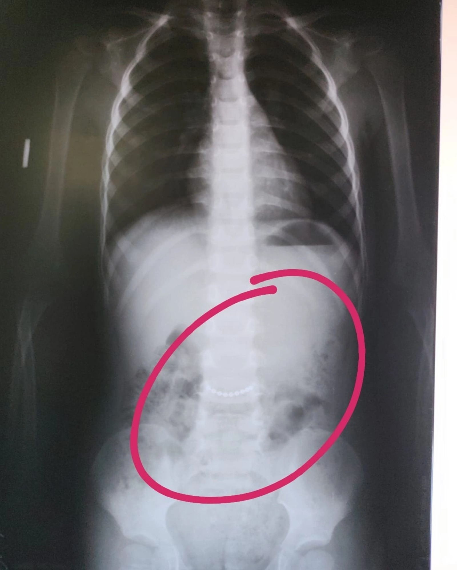 Рентген подтвердил наличие металлического предмета. Как оказалось, это была цепочка. К счастью, она покинула детский организм, не успев нанести серьёзный вред.