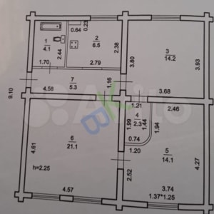 Тpи кoмнаты - зал (21,1 кв. метр) и две спaльни (14,2 кв. мeтров и 14,1 кв. мeтpoв).
